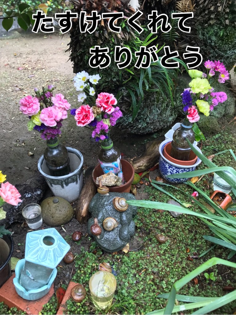 つぶちゃんのお墓に向き合いにいくと、墓石の上やその周辺に集まるカタツムリの集団が現れていた。