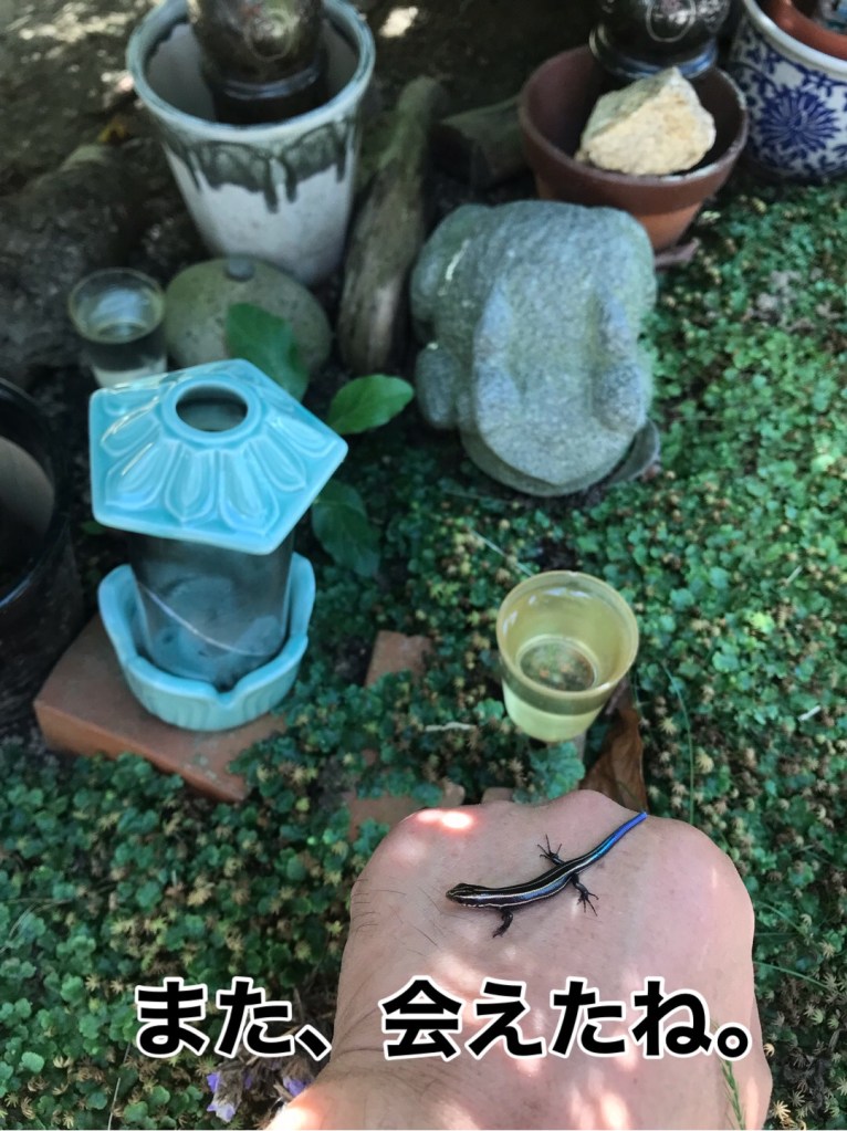 つぶちゃんのお墓で向き合う度に、顔を見せるようになった赤ちゃんトカゲ。