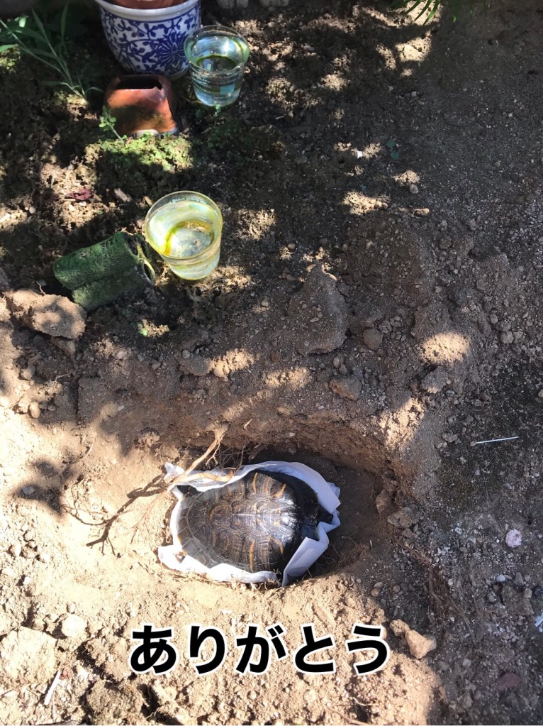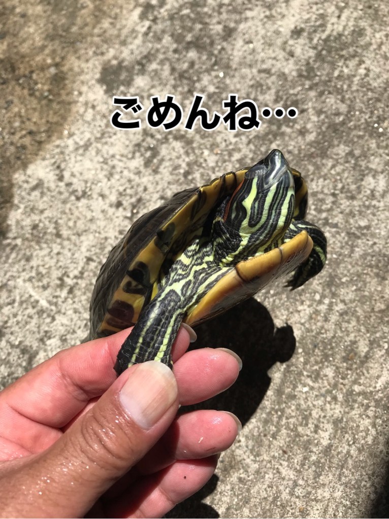 そう語りかけながらカメちゃんを持ち上げると、薄目を開けていた眼はすっと閉じた…。