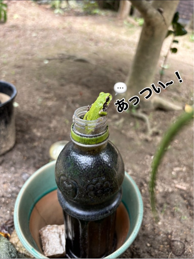 当のアマガエルは、つぶちゃんのお墓の供花用に据えたペットボトルの口元に身体を差し込んで、中の水を利用して身体を冷ましていた。