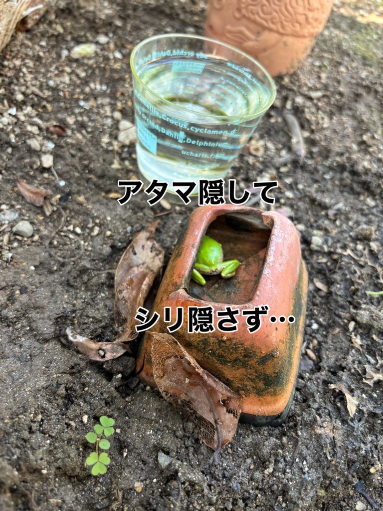 “小さな命たち”の暮らしに役立てばと思い設置したシェルターがあるのだが、その水を溜める窪みの中にアマガエルの背中を発見した。